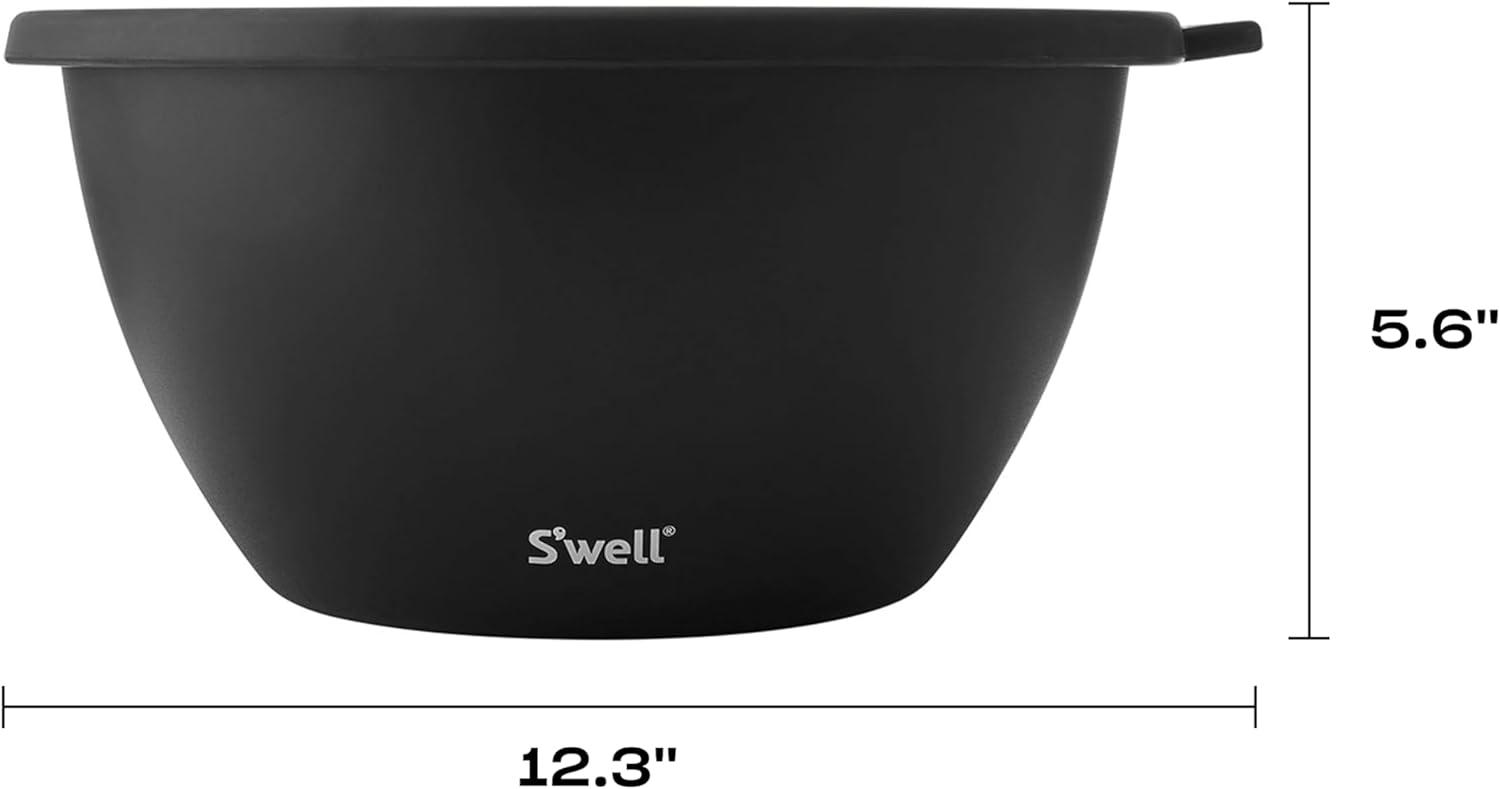 SALAD BOWL KIT XL: 184oz (5.75qt) stainless steel Salad Bowl with 5oz Canister. Includes serving utensils, removable tray and canister for dressing or toppings, and leakproof lid. Top-rack, dishwasher safe. Utensils are hand wash only.