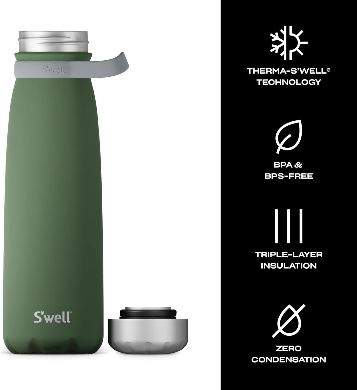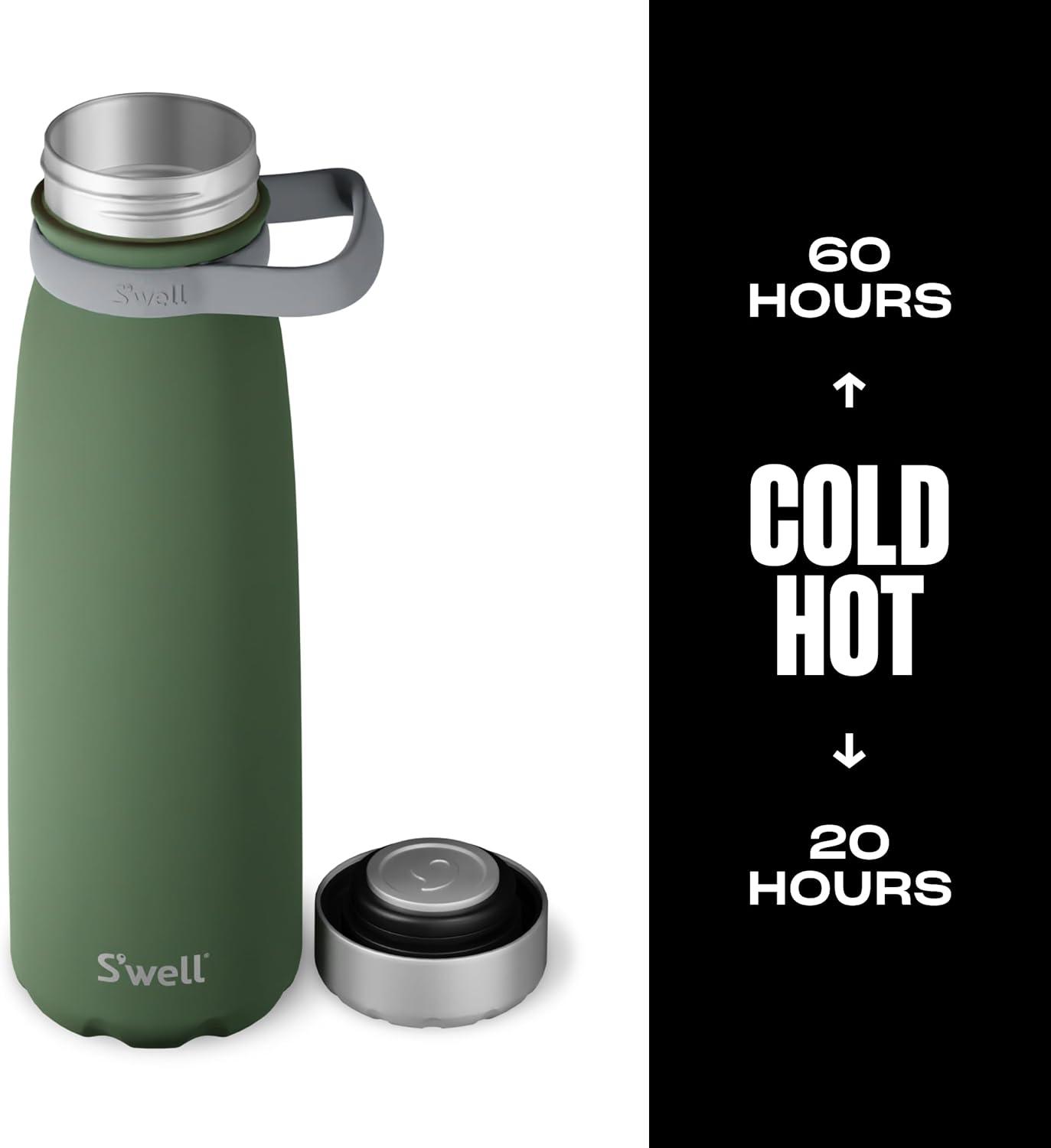 TRIPLE-LAYERED INSULATION: S’well 40oz Traveler with Handle and stainless steel. Triple-layered, vacuum-insulated construction. Exclusive Therma-S’well Technology keeps beverages cold for 60 hours and hot for 20. Sleek and beautifully crafted.