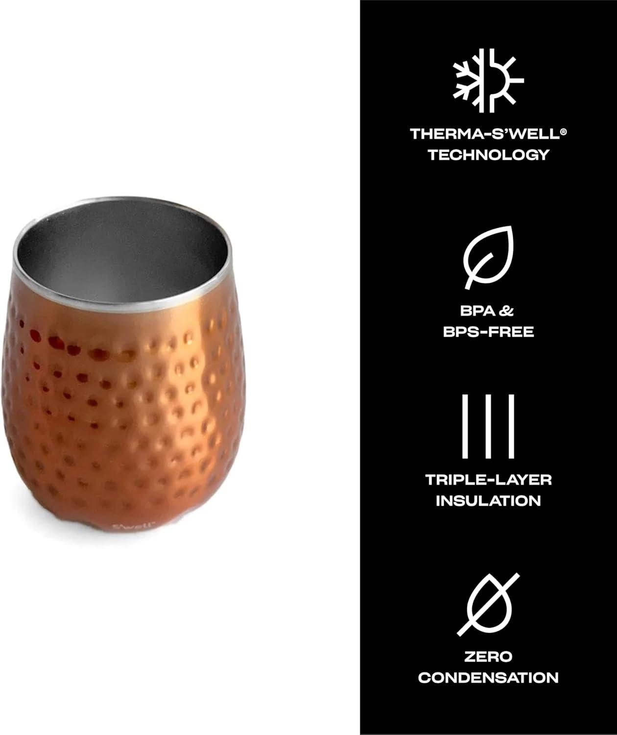 TRIPLE-LAYERED INSULATION: S’well 9oz Wine Tumbler with stainless steel. Triple-layered, vacuum-insulated construction. Exclusive Therma-S’well Technology keeps wine colder for longer. Sleek and beautifully crafted.